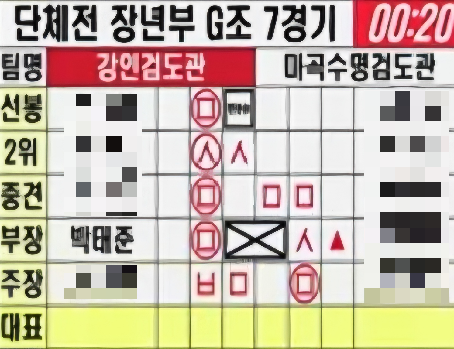 내가 패배하면 경기는 그대로 끝나는 상황에 경기에 들어갔다. 역시 상대방 중단과 압박이 강하다. 내 압박에도 흔들리지 않고 틈이 보이지 않는다. 한판을 내주고 머리 치기로 한판을 따라갔지만 압박해 들어오는 손목머리에 속수무책으로 당했다. 내가 이기거나 비겼더라면 달라졌을 수도 있는 경기결과를 보니 너무 아쉽고 팀에 미안한 마음이 들었다.