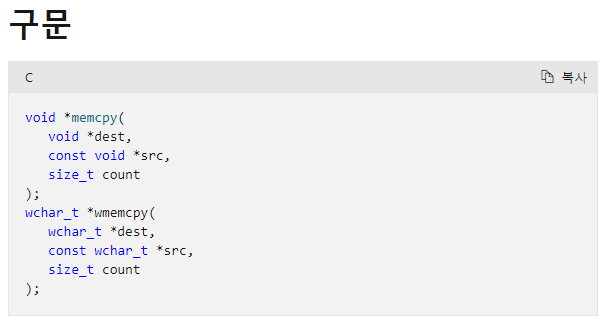 wmemcpy는 뒤로하고 memcpy를 살펴보자. memset과 마찬가지로 세 개의 매개변수가 있다.