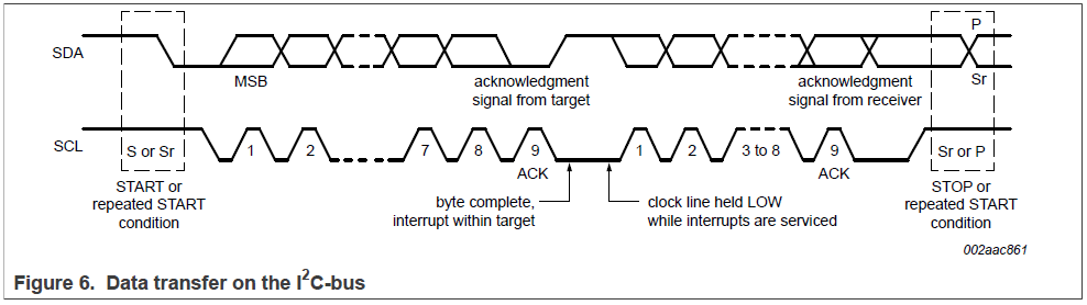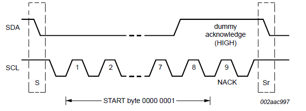 SDA, SCL 라인은 통신을 하지 않는 상태에서는 모두 High를 유지하고 있는다. 통신이 시작되면(START condition) SDA먼저 High에서 Low로(Falling edge) 상태가 변경되고, SDA가 Low가 된 다음 SCL도 High에서 Low(Falling edge)로 상태가 변경된다.