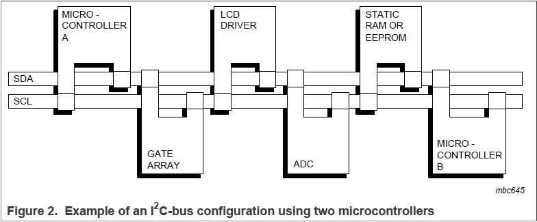 I2C는 2가닥의 라인에 MCU와 다수의 센서가 연결된다. (아래 그림 출처는 NXP의 I2C 데이터 시트)