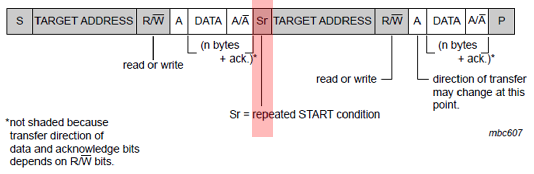 위 그림은 Slave에서 데이터를 읽어오는(Master 기준) Read Protocol이다. START Condition부터 Sr 이전까지는 Write Protocol과 동일하다. Read 동작을 하기 전, Slave에서 어떤 Register의 값을 읽어올지 미리 알려줘야 하기 때문에 Write 명령을 먼저 보내줘야 한다. DATA에는 Register address를 넣어준다. Slave에서 ACK/NACK를 전송한 다음 STOP conditiond 아닌 "repeated START condition"이라는 게 보인다. 통신을 종료하지 않고, 다시 시작하겠다는 의미다.