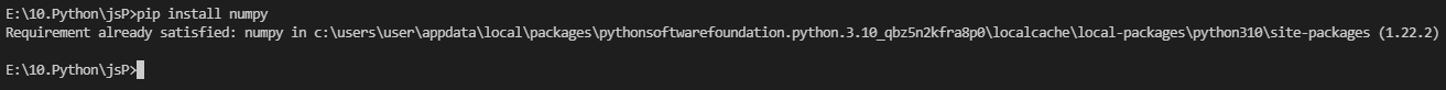 터미널 창에 1번과 같이 입력하면 넘파이가 설치된다. (여기서 말하는 터미널 창은 VSC 또는 파이썬 터미널 창을 의미한다.) conda에서는 2번과 같이 입력한다. 난 이미 설치해서 설치되어 있다고 나온다.